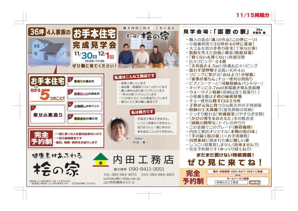 お手本住宅 「謳歌の家」完成見学会 開催!! 日程 2019年 11月 30日 (土) ~ 2019年 12月 01日 (日) 時間 10:00 am ~ 5:00 pm 場所 宇部市 開の周辺 このイベントは終了しました。次回の開催をお待ちください。子育て4人家族の「謳歌の家」 とっても素敵な建物です。 是非是非予約の上見学下さい! 予約終了後、詳しい地図と案内を送ります!! 「謳歌の家」宇部市 開周辺 詳しい地図は 予約の上 親方 内田に お問い合わせ下さい