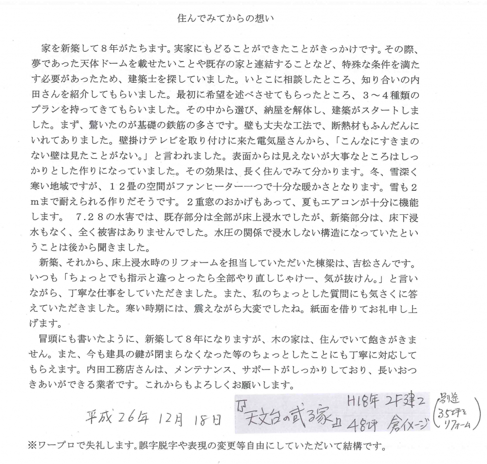 新築、それから、床上浸水時のリフォームを担当していただいた棟梁は、吉松さんです。いつも「ちょっとでも指示と違っとったら全部やり直しじゃけ一、気が抜けん」と言いながら、丁寧な仕事をしていただきました。また、私のちょっとした質問にも気さくに答えていただきました。寒い時期には、震えながら大変でしたね。紙面を借りてお礼申し上げます。