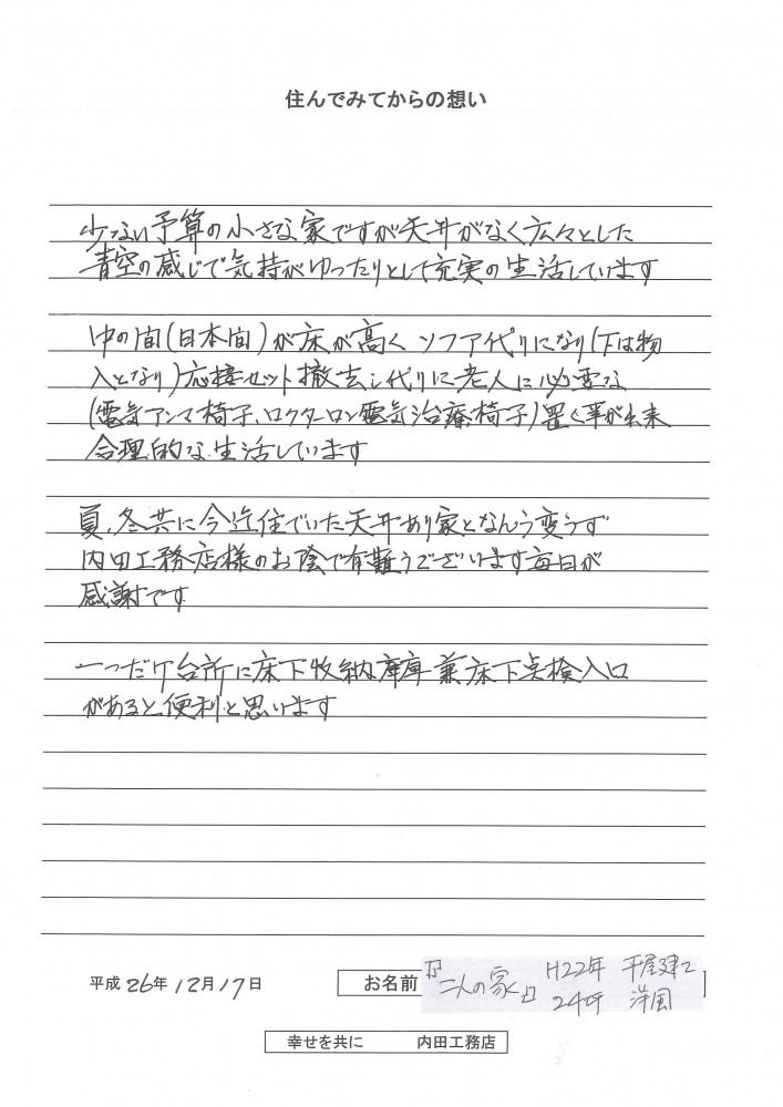 二人の家少ない予算の小さな家ですが、天井がなく広々とした青空の感じで気持がゆったりとして充実の生活しています。 中の間(日本間)が床が高くソファ代りになり(下は物入となり)、応接セット撤去し、代りに老人に必要な(電気アンマ椅子、ロクターロン電気治療椅子)置く事が出来、合理的な生活しています。 夏、冬共に今迄住んでいた天井あり家となんら変らず、内田工務店様のお陰で有難うございます。毎日が感謝です。 一つだけ、台所に床下収納庫兼床下点検入口があると便利と思います。