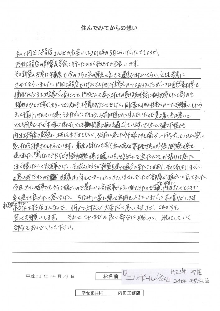 その新築のお宅は平屋で今のうちの原点と言っても過言ではないくらい、とても参考にさせてもらいました。内田工務店ではなくても他に住宅メーカーはありましたが、一つは自然素材を使用されているエコな家だと言うことと、内田さんの家に対しての色々な知識に納得したと言うのも理由のひとつですが、もう一つの決め手は予算的なことでした。同じ家を他の住宅メーカーでお願いしたらきっと予算外になっていて建てられなかったでしょう。以前は団地に住んでいたので夏は暑く冬は寒いと、とても不快でしたが木の家に住んで、とても快適に毎日を過ごしています。マイホームを建てた後でも内田工務店の見学会にはおじゃまさせてもらい、3年前に建てたウチの家よりも増々グレードアップしているなと羨ましく思いながら拝見させてもらっています。最近の話なのですが、私の友人が某木造住宅の外張り断熱の家を建てました。「寒くなってきたけど外張り断熱の家は暖かい?」と言うメールを送ったところ、外張りは思ったほど暖かくないと言う返事でした。その友人はうちが新築を建てて遊びに来たことがあり、その時は11月くらいの寒い時だったので暖房はパネルヒーターしかつけていませんでしたが部屋が暖かいと言ってました。今回、メールの返事でもうちは暖かいので羨ましいと言う返事がかえってきたのですけど、本当に内田さんのところで家を建てて良かったと思いました。ちなみに家に帰って玄関を入るといまだに木の香りがします。社員数も少ない小さな工務店さんなので、何かと対応が大変だと思いますけど、これからも宜しくお願いします。それとこれまでの良い部分は残しつつ、進化していく部分もありでいって下さい。
