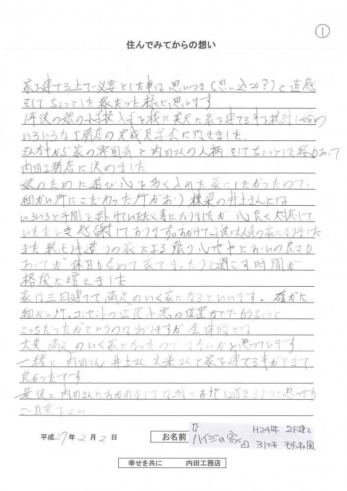 一緒に内田さん、井上さん、大楽さんと家を建てる事ができて良かったです。