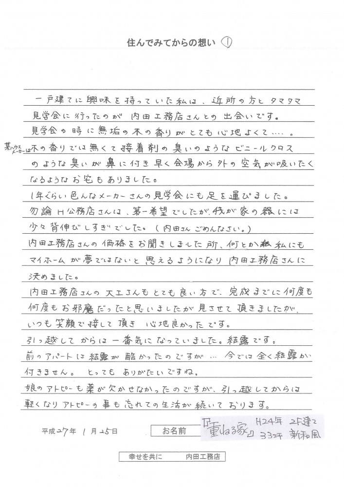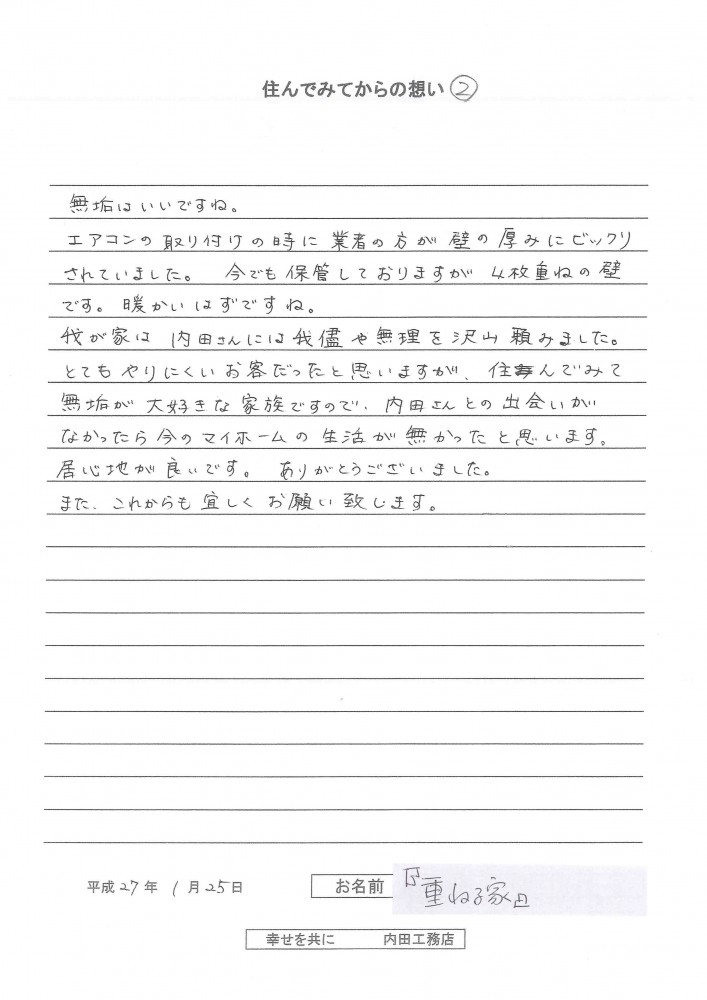 我が家は内田さんには、我儘や無理を沢山頼みました。とてもやりにくいお客だったと思いますが、住んでみて無垢が大好きな家族ですので、内田さんとの出会いがなかったら今のマイホームの生活が無かったと思います。