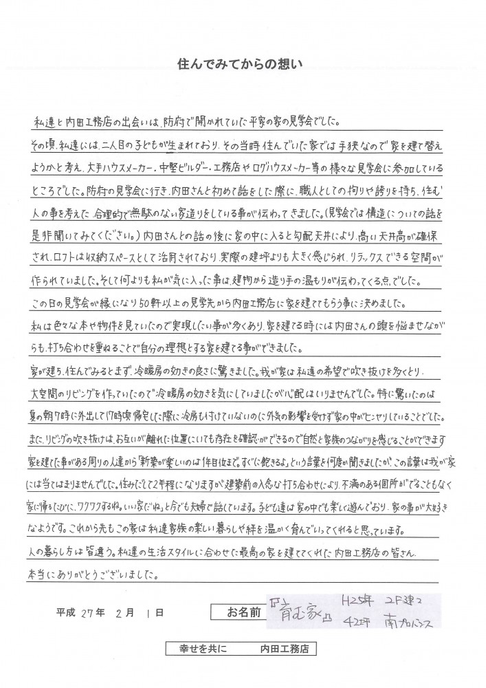 この日の見学会が縁になり50軒以上の見学先から内田工務店に家を建ててもらう事に決めました。