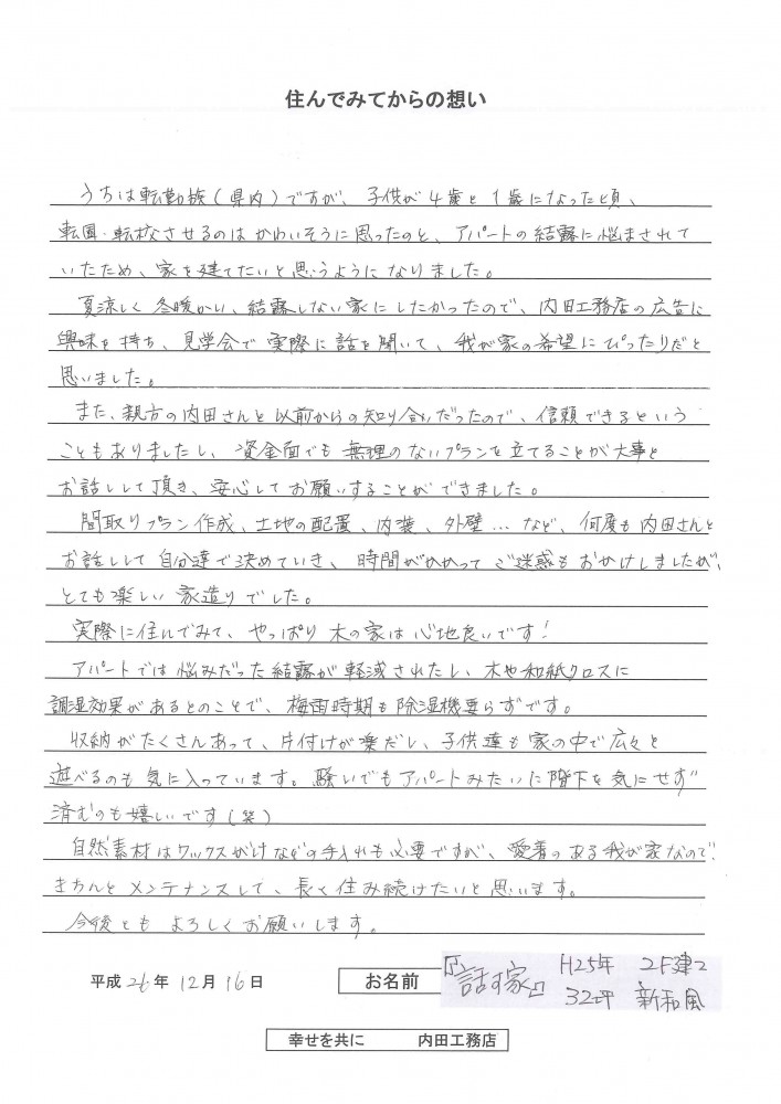 夏涼しく冬暖かい、結露しない家にしたかったので、内田工務店の広告に興味を持ち、見学会で実際に話を聞いて、我が家の希望にぴったりだと思いました。