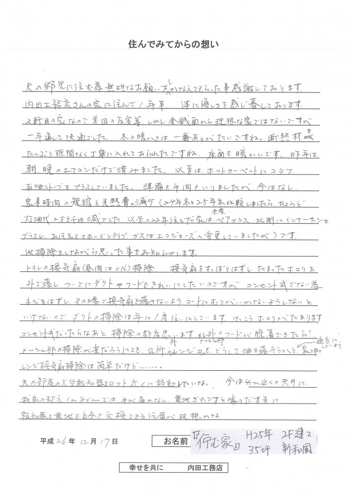 内田工務店さんの家に住んで1年半、体に優しさを感じ暮しております。